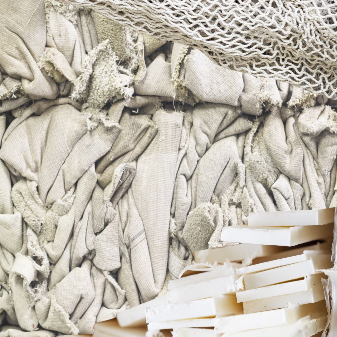 Le système de régénération ECONYL® commence par le sauvetage de déchets comme les filets de pêche, les chutes de tissus, les moquettes et le plastique industriel.
